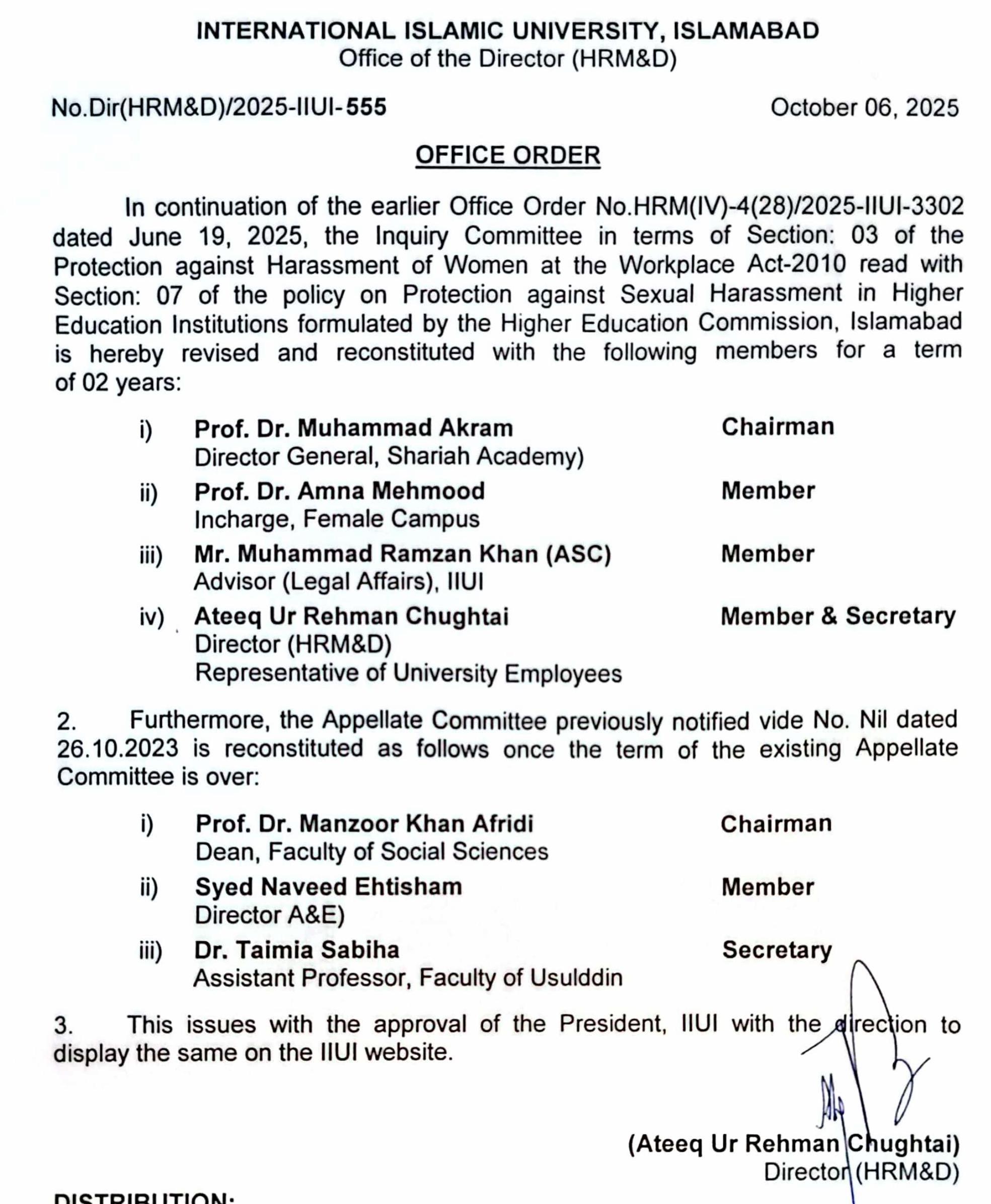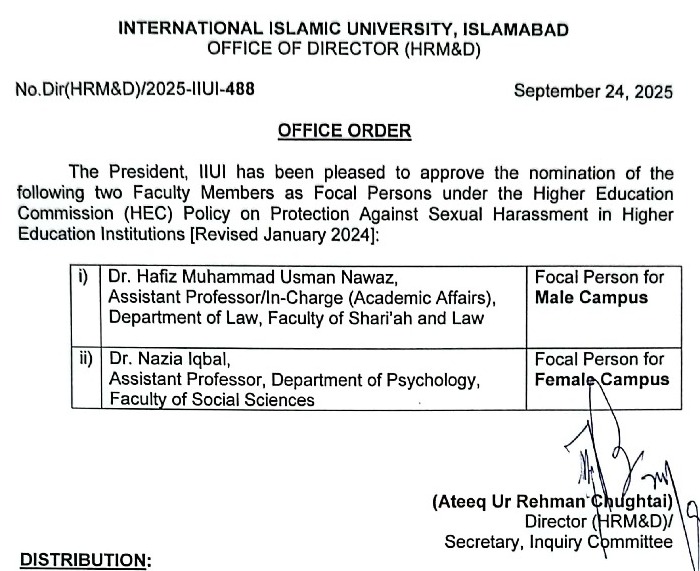 As per direction of the Worthy President IIUI and in the light of existing approved policies and acts, the anti-harassment committee has recommended that any complaints in this regard across the campus from students and employees shall be addressed on immediate basis.