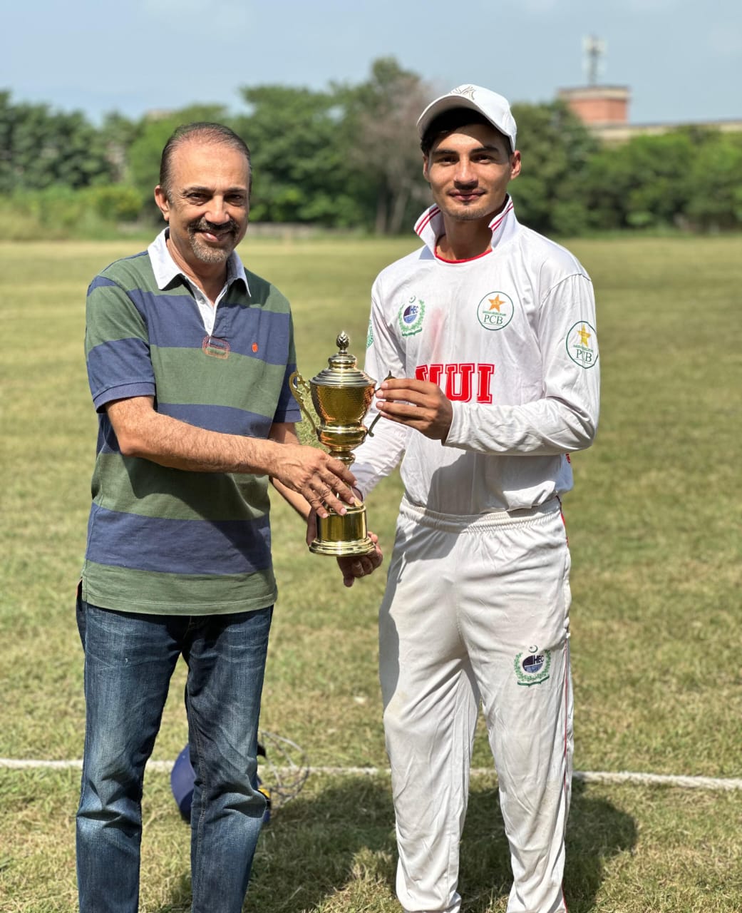 Following the match, Director Student Affairs (Male) Dr. Hafiz Ghufran Ahmad, joined by cricket coach Sir Naseer Ahmad, applauded the players’ performances and presented the Man of the Match award to Hamza Mashwani for his exceptional bowling. Dr. Ghufran also commended the Sports Department and Coach Naseer for their efforts, assuring the university administration’s continued support for healthy sports activities aimed at fostering a vibrant and active campus environment.