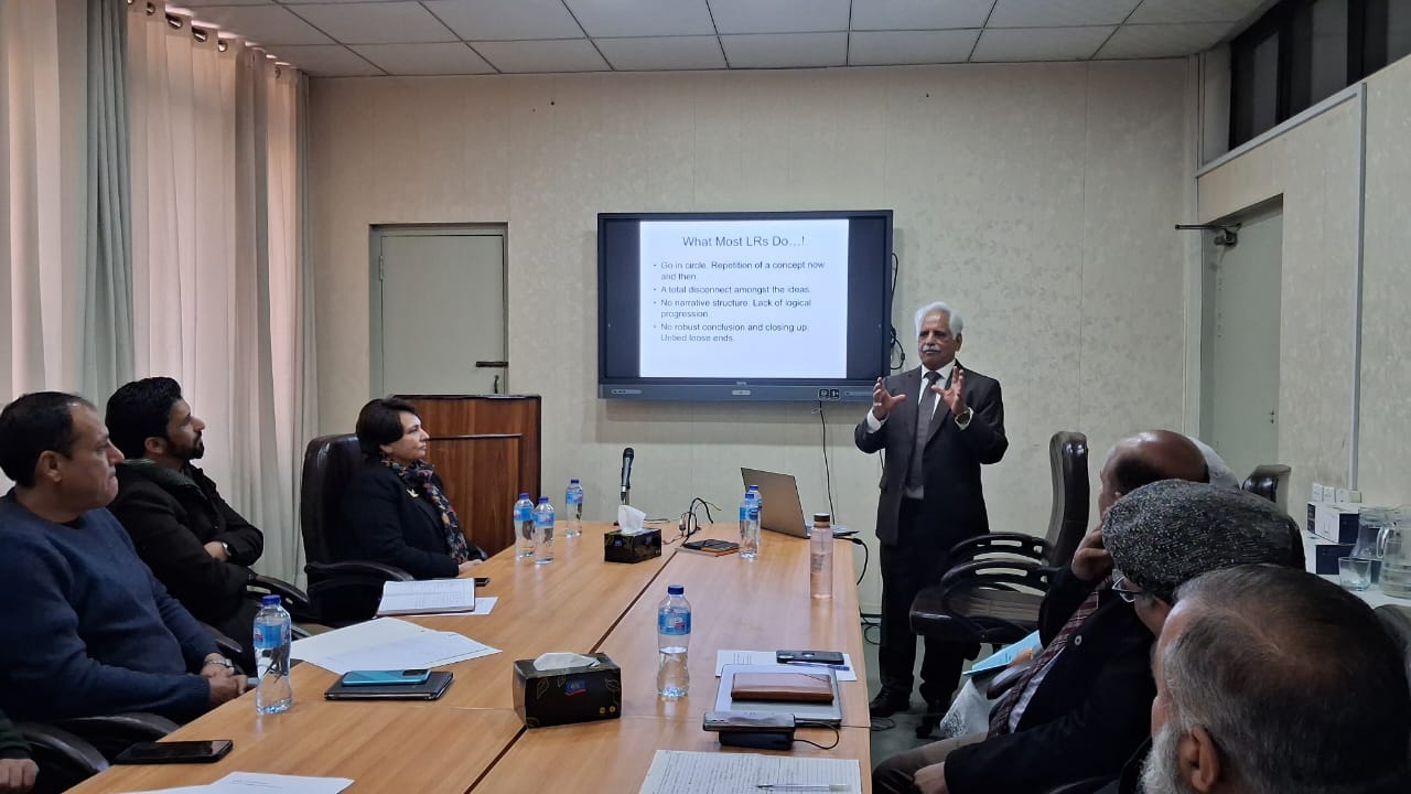 The second day included capacity-building activities, notably a workshop on AI-assisted literature review conducted by Dr. Salma Kaleem. Participants were introduced to digital research tools, AI-supported platforms, and automated techniques for literature searches and synthesis. The afternoon session featured a workshop led by Prof. Dr. Raja Nasim Akhtar, who emphasized structured approaches to literature review, including description, evaluation, and synthesis. He discussed strategies such as hierarchical structuring and guided questioning to strengthen analytical depth and coherence in academic writing.