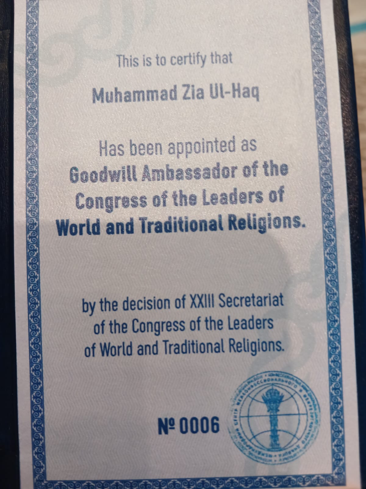 On the recommendation of the XXIII meeting of the Secretariat of the Congress of World and Traditional Religions Leaders, held on September 16, 2025, in Astana, the President of the Republic of Kazakhstan appointed Prof. Dr. Muhammad Zia-ul-Haq as Goodwill Ambassador of the Congress.