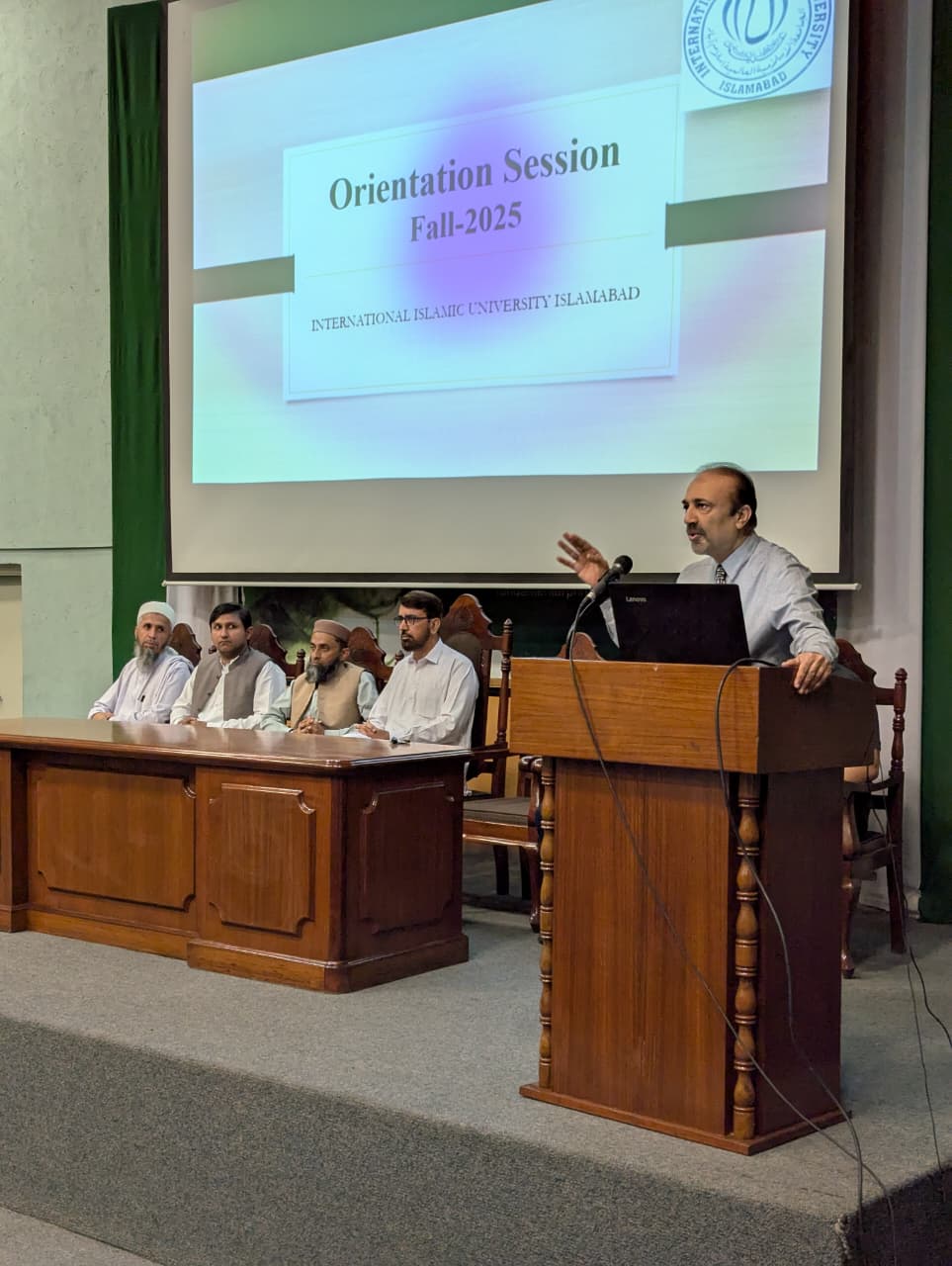 The session began with the recitation from the Holy Quran followed by the National Anthem. Director Students Affairs (Male), Dr. Ghufran, welcomed the students and briefed them on academic and administrative matters. He encouraged them to treat their time at IIUI as a turning point to achieve academic, personal, and career goals. He also highlighted the importance of extracurricular activities, teamwork, and maintaining ethical values during their academic journey.