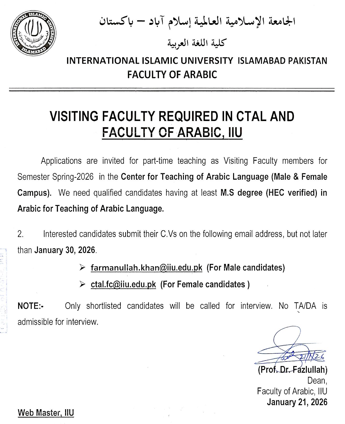 Walk-in-Interview – Department of History & Pakistan Studies 08/09/2025